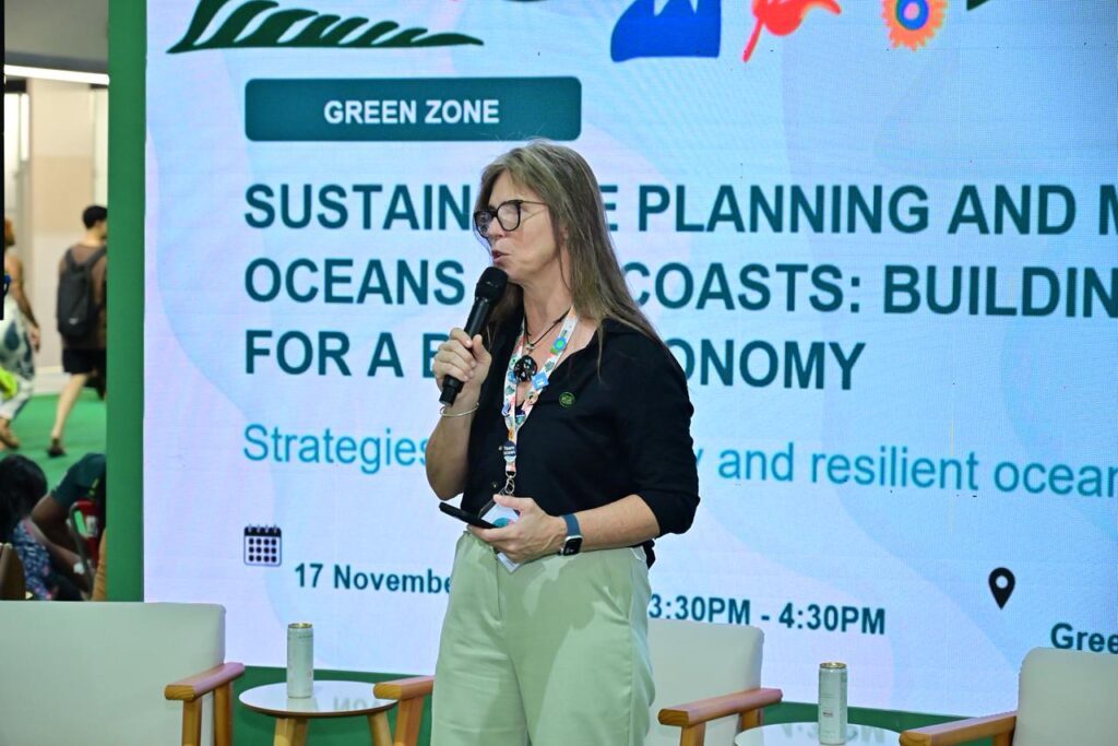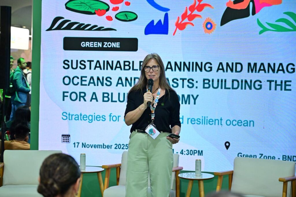 Além dos avanços diplomáticos, Marinez participou de debates técnicos na Blue Zone e em pavilhões temáticos, reforçando a importância do planejamento e da gestão sustentável dos oceanos e das zonas costeiras, bem como a urgência de ampliar soluções baseadas na natureza. Nas agendas desenvolvidas em parceria com o IAR, ela destacou o papel do Programa Bandeira Azul, referência internacional na qualificação ambiental de praias, marinas e embarcações. Em Belém, o programa foi apresentado sob uma perspectiva histórica, evidenciando como sua metodologia transforma práticas locais de gestão costeira em políticas públicas, algo crucial em um momento em que o oceano assume centralidade na agenda climática.